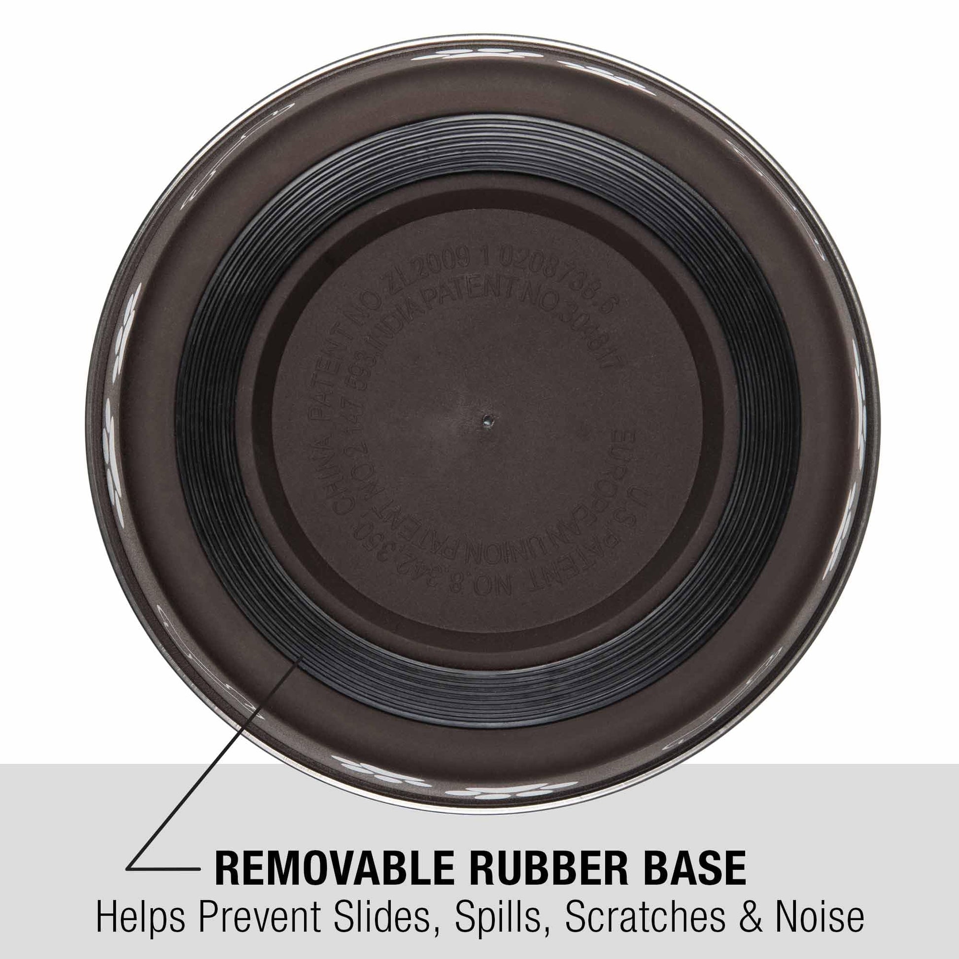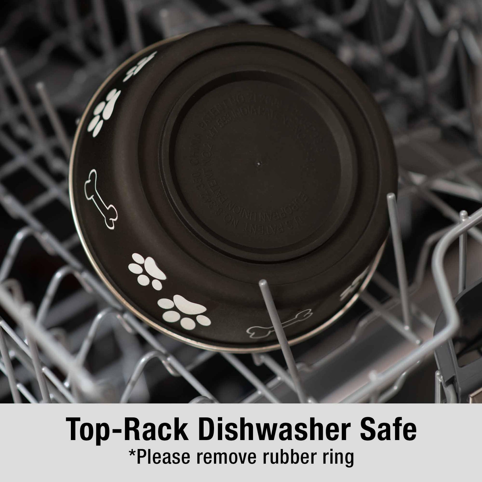 Details: This large espresso brown stainless steel dog food and water bowl has a no-tip, no-skid design that prevents spills, making a Bella Bowl the perfect dish for your furry friend. These bowls are designed to be both functional and stylish. Whether you use it for dry or canned food or water, both you and your pet will enjoy the design and function of these bowls. Your pets mean the world to you, which is why these bowls are of the highest quality. They feature a revolutionary, patented and award-winning design. No matter which size or color option you choose, you'll bring the bestselling bowl in the pet industry into your home. Since your dog bowls likely sit out between meals, ensure they work well with your decor. Available in an array of sophisticated shades, Loving Pets Bella Bowls can complement any aesthetic with an expanding range of metallic colors. The paw print adds a decorative element and finishing touch, making these bowls just what you're looking for. Along with offering a stylish appearance, these bowls provide exceptional durability. They are built to last with an interior made out of stainless steel and an attractive polished poly-resin exterior. Each Loving Pets Bella Bowl features a removable soy-based rubber ring. If your dog has a habit of nosing their food or water bowl around, this rubber base will help keep the bowl in place instead of sliding their meal all around your home. The no-skid dog bowl design also helps prevent spills and noise during mealtimes. These vet-recommended stainless steel bowls are also dishwasher safe, making it easier than ever to keep your pet's food or water bowls clean and hygienic. The design doesn't hold odors and is rust-resistant, making it an excellent alternative to plastic. Remove the rubber base and toss the bowl in the dishwasher, reducing your daily cleanup time.