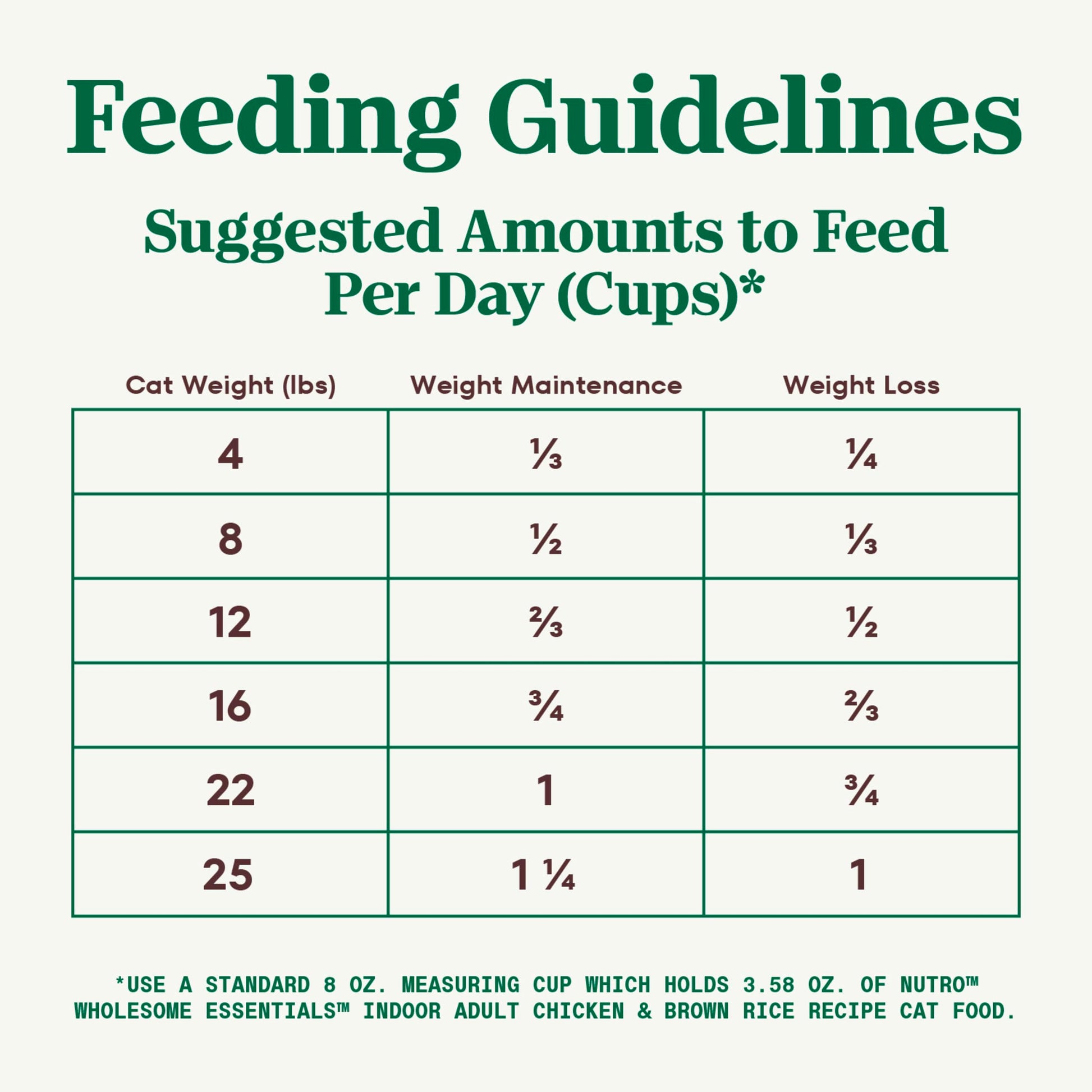 Details: Nutro Wholesome Essentials Indoor Cat Food Dry, Chicken and Brown Rice Recipe is crafted with real chicken as the #1 ingredient, providing a flavor that your cat will enjoy. Nutro believes in the power of healthy cat food recipes with wholesome ingredients to support the health and happiness of your feline companion. Made with essential nutrients and antioxidants to support whole-body health, this dry cat food is designed to meet the specific needs of indoor cats. It supports healthy immunity with essential antioxidants like Vitamin E and Selenium and is rich in Omega 6 Fatty Acids for a healthy skin and coat. Crafted with natural prebiotic fiber to support healthy digestion, this healthy cat food recipe is made with natural ingredients plus vitamins, minerals and other nutrients. Nutro Wholesome Essentials Indoor Dry Cat Food Chicken and Brown Rice Recipe is a thoughtful choice for maintaining your indoor cat's overall well-being and vitality.